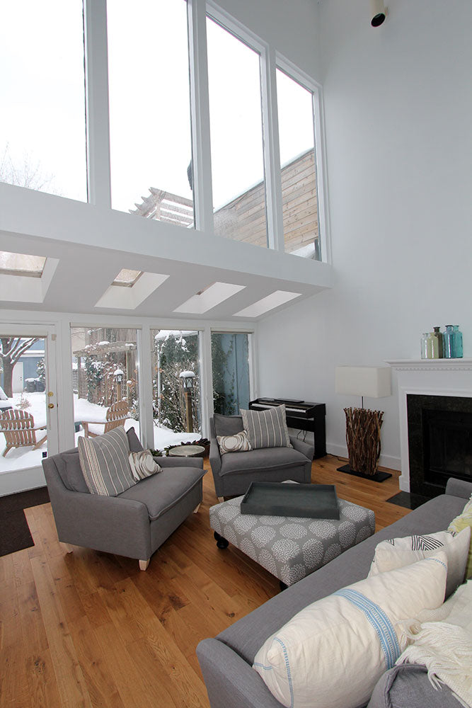 The living room has a 3 storey cathedral ceiling and overlooks a beautiful garden with a deck. The deck has a sitting and dining area which is a great place to enjoy during the warmer months.